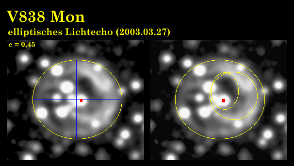 Durch eine HST-Aufnahme animiert kam ich auf die Idee, in einer meiner Aufnahmen von V838 Mon einen der äußeren Umrandung des Lichtechos folgenden Kreis einzuzeichnen. Ich stellte mit Überraschung folgendes fest: