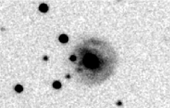 Interessant wäre vielleicht noch die Elliptizität des Lichtechos. Zu Beginn war es (annähernd) kreisrund. Auf der letzten ausgewerteten Aufnahme vom 08.02.2004 gibt es Strukturen im (äußeren) Lichtecho, die es deutlich elliptisch erscheinen lassen. Auch das "innere Lichtecho" ist alles andere als kreisrund. Nach der Formel zur Bestimmung des E-Typs von elliptischen GX ergab sich ...