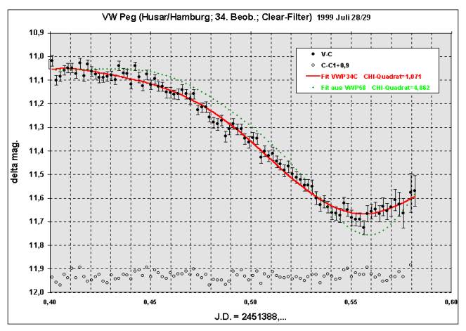 Von VW Pegasi gab es auch nach 3 Jahren intensiver Beobachtungstätigkeit – insgesamt weit über 5000 Einzelmessungen – aufgrund der langen Periode, der langen Bedeckungsdauer, aber auch wetterbedingt überwiegend unvollständig beobachtete Minima. Ich sah mich daher vor die Aufgabe gestellt, diese zu nutzen. Nachdem erkannt war, daß die beobachteten Minima leichte Unterschiede aufwiesen, konnte diese Erkenntnis systematisch eingesetzt werden.