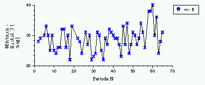 Die Minima zeigen eine deutlichere Periodizität von etwa 50 Zyklen, wie man schon mit bloßem Auge in Abb. 5 erkennen kann. Da der gesamte Beobachtungszeitraum aber nur um dreißig Prozent länger ist als diese Periode, ist das Ergebnis vorläufig mit Zweifeln behaftet. Das Minimum im Verlauf der Minimalhelligkeit scheint aber etwa zehn Zyklen vor dem Minimum der Maximalhelligkeit aufzutreten, also um etwa 20 Prozent versetzt.