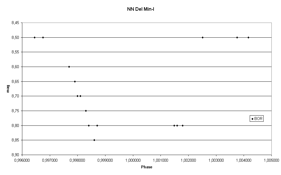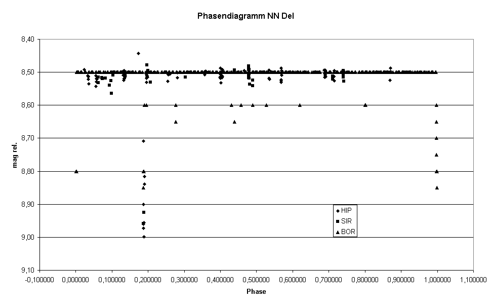 Daher werde ich im Folgenden die von Hipparcos, E. Born und mir gesammelten Daten im Lichte der von den spanischen Beobachtern gefundenen Elemente darstellen. Dabei tut es keinen Abbruch, dass E. Born visueller Beobachter ist. In den Nächten, in denen wir offensichtlich gemeinsam beobachtet hatten, stimmten seine geschätzten Werte mit meinen gemessenen Werten hervorragend überein. Zusätzlich standen mir auch noch Schätzungen des französischen, visuellen Beobachters M. Dumont zur Verfügung. Doch Werte, die NN Del plötzlich um einige Zehntel mag heller zeigten als maximal möglich sowie einige nicht erklärbare Streuungen, machten mich stutzig. Die Diskussion mit M. Dumont zeigte dann, dass einer seiner Vergleichssterne ein Veränderlicher mit einer Amplitude von 0,25 mag war. Daher konnten die Daten leider keinen Eingang in die Bewertung finden, sondern dienten eher als Hintergrundmaterial.